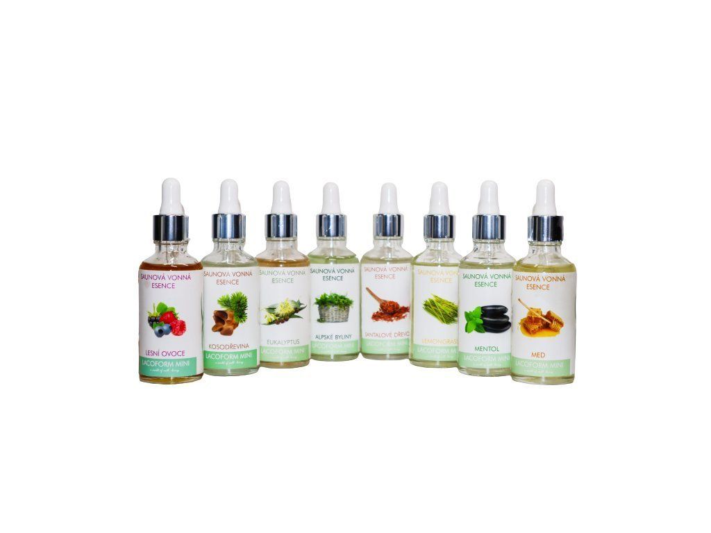 Koncept Lacoform Mini zahrnuje sadu základních šesti esencí + 2 zesilovací esence. Je primárně určen pro domácí použití. Praktická malá balení s kapátky umožňují dávkování esence do saunové naběračky a měnit vůně během saunování. Základní esence: Lemongrass, Kosodřevina, Eukalyptus, Alpské byliny, Santalové dřevo a Lesní ovoce nabízí ty nejlepší zástupce jednotlivých typů vůní, od citrusových přes bylinné či ovocné až k mátovým. S přidáním zesilovací esence Med můžete dodat základním vůním sladký, těžký nádech. S přidáním zesilovací esence Mentol můžete naopak základní esenci odlehčit a doplnit ji o lehké, větrové tóny.